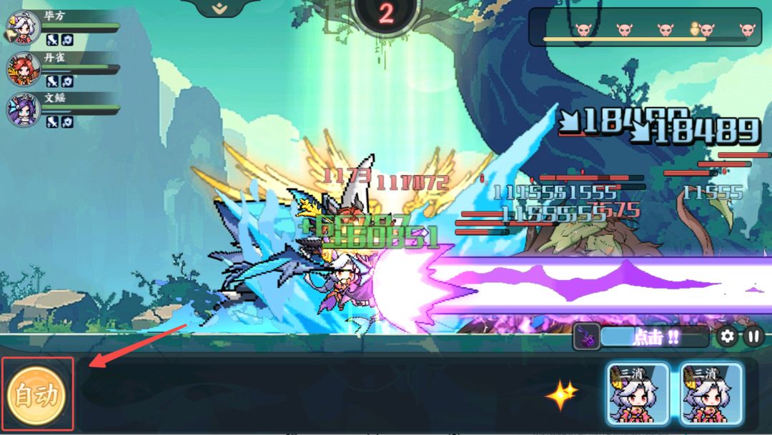 不过没关系,在游戏初期我们就提供了自动战斗的功能,会根据“凑三消”的原则自动进行消块,足够应付大多数战斗了。