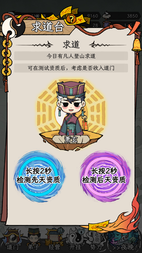 2、 弟子养成生态:招募性格迥异的求道者(如书生、樵夫、游侠),因材施教传授符箓、炼丹、占卜等道术,其成长路径受心性与机缘双重影响。