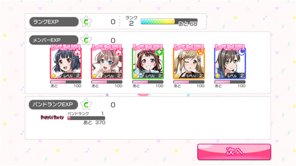 最后是经验值分配,LIVE 结束后能分别得到Rank、角色以及乐队的经验值,经验值的多寡取决于玩家所获得的分数评级。其中Rank 上升后LIVE Boost 会+3(即使满3 个时亦会突破上限),亦能解开主线故事,乐队等级上升后能解开乐队故事。
