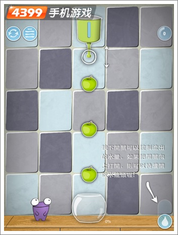 第1关:上下滑动储水箱的出水口会有水流出,或是向上滑动右下角的水滴图标,让水流通过三个苹果收集苹果,在流到鱼缸中,鱼缸里水量为百分百时,游戏过关。