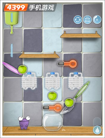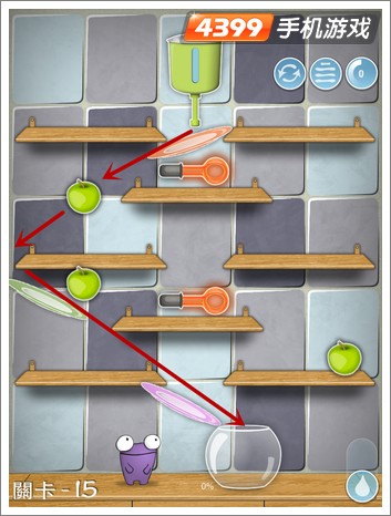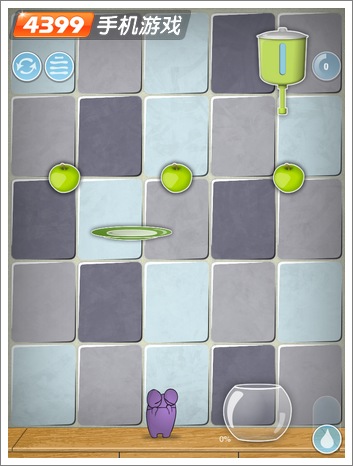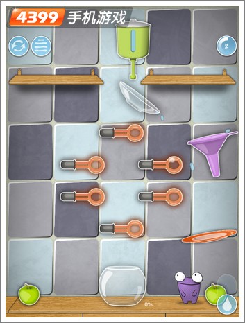 第2关:左右移动把储水箱依次移到三个苹果上方,滑动出水口让水滴到苹果上,把苹果收集起来,再将储水箱移到鱼缸上方,把水全部放入鱼缸中,游戏过关。(ps:注意避开移动的盘子。)