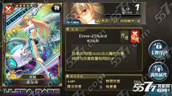 简评:佣兵另一张吸血刀,和水妮妙相比,输出高些,但4c有些卡手,0血全攻的属性分配更让人不太安心。不过吸血效果还是作用蛮大的,如果卡组血量足够,对风系boss时还是尽量带上一张。