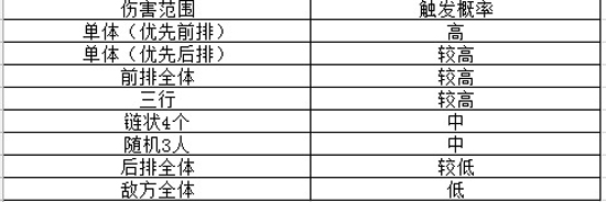全体技能为低,后排技能为较低,链状、前排为中,三行,前排,单体后排为较高,单体前排技能为高。那么在一个阵容体系里,必须要将伤害范围和技能概率都统计起来,一味追求概率高则伤害范围小,追求大范围则概率小。