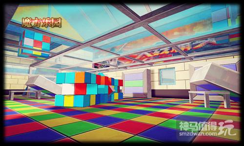 魔方乐园是一个两层式的房间,双方的复活点都有一个可以爬到第二层的斜坡,第二层上面是空荡荡的,只有几处地方是没有玻璃的地面,玩家不小心可能会掉落到第一层。