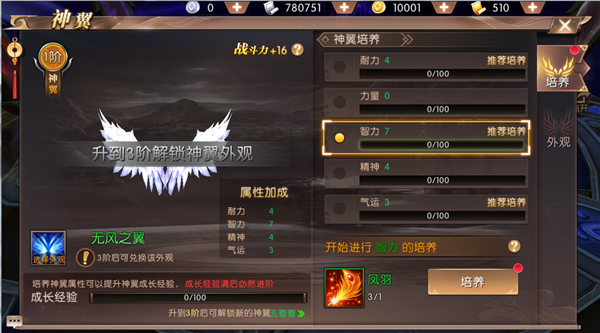 光拥有道具还是不能完全激活神翼的,神翼的激活跟培养是息息相关的,神翼培养需要消耗凤羽,不同等级消耗凤羽品质也是不同的,在进行神翼培养时,可以自由选择想要培养的属性进行培养,(建议各位勇士根据你们的职业来进行培养)属性提升的同时会增加成长经验,任何属性提升增加的成长经验数值都是一样的,任何属性在当前阶等都可能培养到满,需要升阶才能继续培养,当成长经验满的时候,只能进行升阶操作,升阶之后可以继续选择属性来进行培养。神翼培养跟外观是息息相关的。