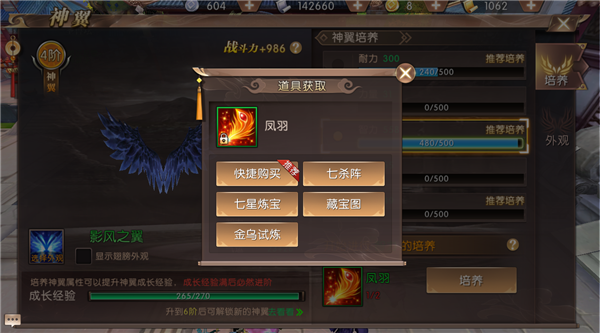 想要激活神翼,就要用到道具,神翼激活并不难,只需要用凤羽和御天珠,那这两种道具要如何来获得,我们接着往下看。凤羽:可以通过快捷购买(通过血盟工资商店购买),七杀阵,七星炼宝,藏宝图,金乌试练(购买商城小队金乌试练券)。御天珠:快捷购买,七杀阵,金乌试练。