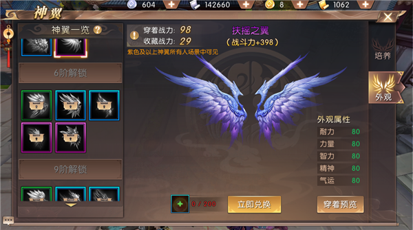 当神翼培养值达到3阶、6阶、9阶的时候,就会解锁相对应的神翼外观,解锁之后,可以使用御天珠来兑换获得神翼外观,不同的神翼需要的御天珠数量也是不同的,特殊的神翼可以通过其他途径来获得。限时神翼可以叠加限时的时长,一旦获得永久的神翼,那么之前存在的限时神翼就会被覆盖掉。如果已经拥有的神翼又获得同类型的限时或者永久神翼,那这些神翼会被分解为凤羽,任何的神翼在穿戴时,战力将会百分之百加入神翼外观战力的计算,未穿戴的神翼,则将会加入百分之30的外观战力。也就是说神翼的总战力是穿着的战力加收藏战力,这个和时装计算战力是一样的。