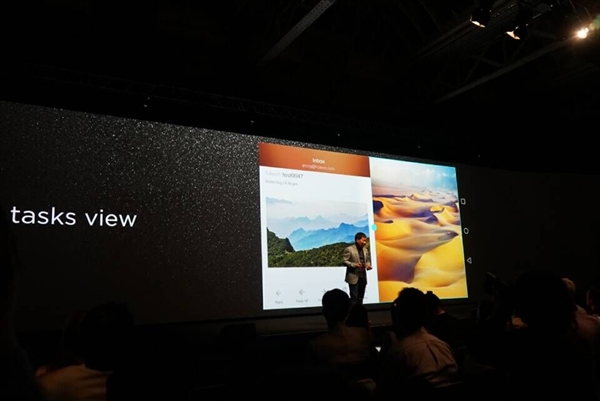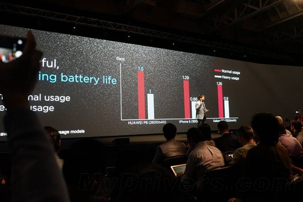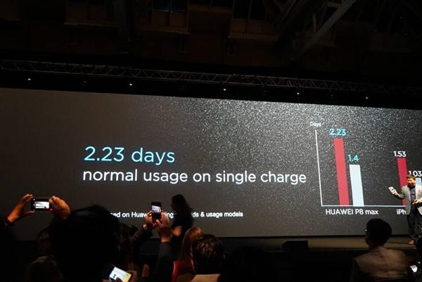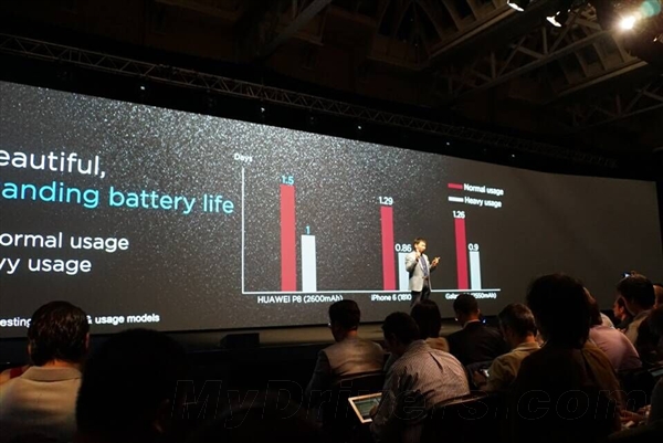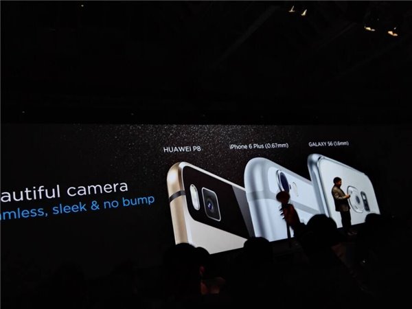 [2015/4/15下午9:44:35] 现场播放宣传片,据称P8采用前置800万像素摄像头,支持全景自拍,机身厚度只有6.18mm。并且该机具有超级省电功能,电量剩余10%还能坚持3小时。