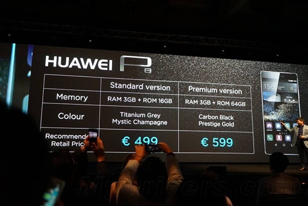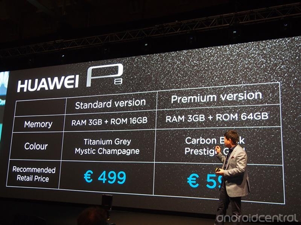 P8标准版:3GB+16GB,灰色、香槟色,499欧元。