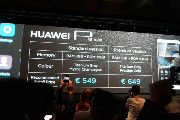 P8 Max也是俩版本,3GB+32GB 549欧元,灰色和香槟色;3GB+64GB 649欧元,灰色和金色。