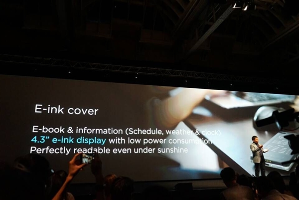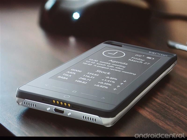 E-Ink外壳。4.3寸屏,可显时间、天气、日程、股市行情等等,功耗很低,强光下可读。