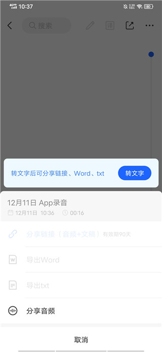 4、导入后返回主页即可查看到文件,点击旁边的【转文字】即可将这款音频转化成文字。