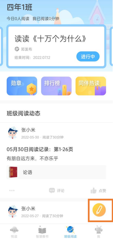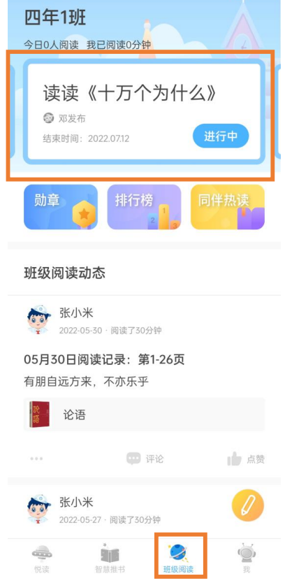 悦读——阅读记录、主题阅读任务、阅读活动挑战主入口。