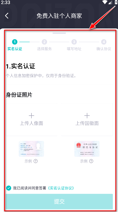 3.先勾选我已阅读并同意签署《实名认证协议》,然后上传自己的个人身份证照片,再点击提交。
