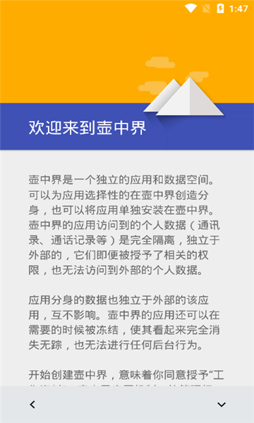 壶中界是一个独立的应用和数据空间。可以为应用选择性的在壶中界创造分身,也可以将应用单独安装在壶中界。壶中界的应用访问到的个人数据(通讯录、通话记录等)是完全隔离,独立于外部的,它们即便被授予了相关的权限,也无法访问到外部的个人数据。应用分身的数据也独立于外部的该应用,互不影响。壶中界的应用还可以在需要的时候被冻结,使其看起来完全消失无踪,也无法进行任何后台行为。