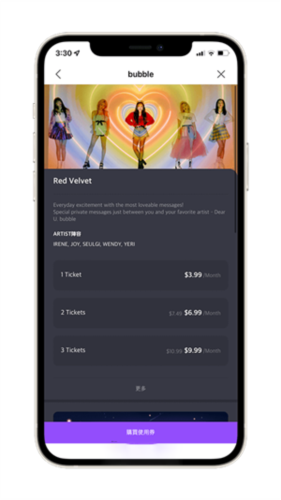 接着,它会显示不同张数的使用券价格,一张是3.99 美金(约110 ~ 120 台币),两张是6.99 美金等等,而且一张Ticket 只能用在一个艺人,并且会自动每月续订。这里请直接点选「购买使用券」。