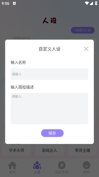 3、在人设页面点击右上方自定义人设,可以根据自己的需要输入内容,可以自己设置人设。