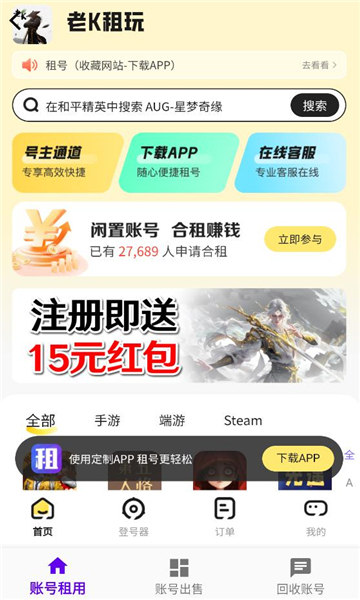 老k电竞app是一款专业,全面,安全的电竞游戏租号平台,这里的游戏种类丰富,既可以便宜租号,还可以进行账号出售,账号回收等操作,内置的一键上号功能也是比较实用的,欢迎前来体验。