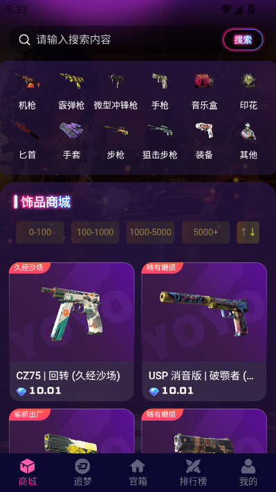 YOYO藏宝阁app是款聚焦于csgo游戏饰品交易平台,包含了csgo和cs2两版游戏饰品、枪皮资源,所有交易都是公开透明,没有强制要求,玩家可以根据自己的需求自由选择交易,提供完善的交易流程,确保交易顺利。