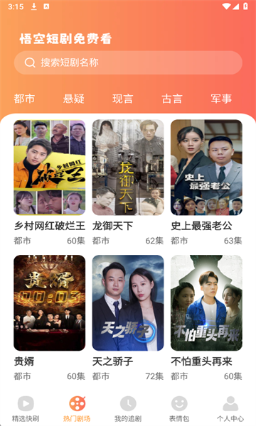 悟空短剧免费看是一款短剧资源十分丰富的手机短剧软件,汇聚了超多短剧资源供大家免费进行收看,包括都市、悬疑、现言、古言、军事等等多种题材供大家选择观看,喜欢看短剧的用户一定不要错过!