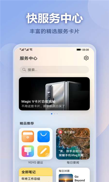 荣耀快服务中心怎么打开?有什么用?这是荣耀官方推出的卡片管理和使用工具,主要服务荣耀机型,可以快速访问系统和便民工具,作为一个卡片的统一入口,它具有轻便,高效的特点。