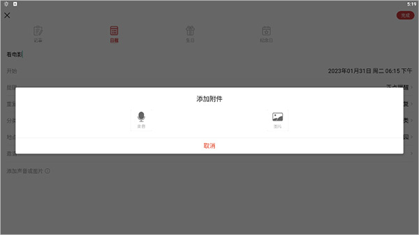 另外日程中还可通过点击【添加声音或图片】来添加录音和图片