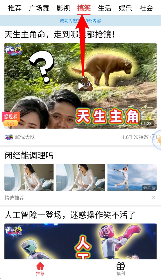 2、切换到“搞笑”频道可浏览搞笑类视频,内容轻松幽默,适合放松心情和休闲娱乐时观看。