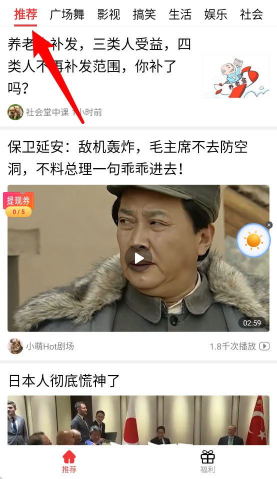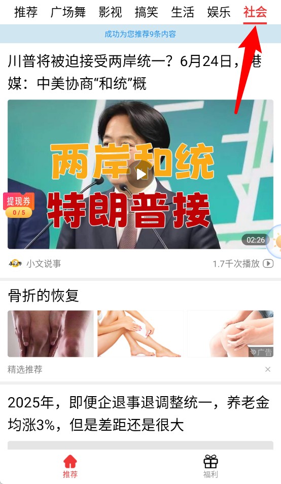 1、首页默认进入“推荐”频道,可查看各类热议资讯视频,涵盖社会、健康、娱乐等多个内容板块。