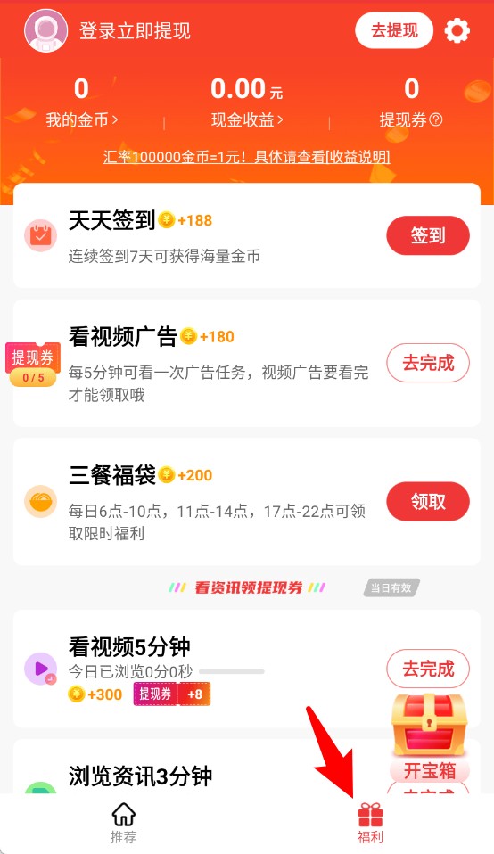 4、点击底部“福利”入口进入福利中心,完成签到、看广告等任务可获得金币和提现券奖励。