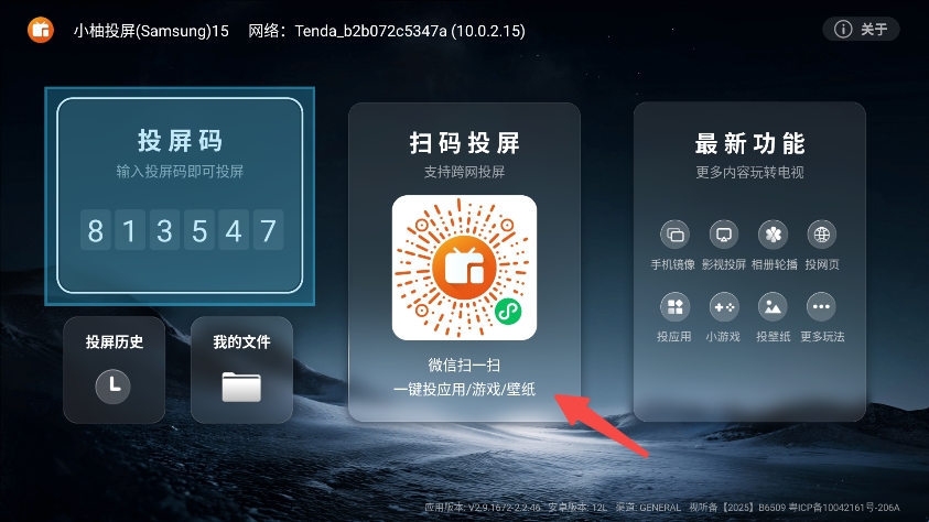 1、确保手机与电视等投屏设备处于同一WiFi网络,在电视上安装小柚投屏app。
