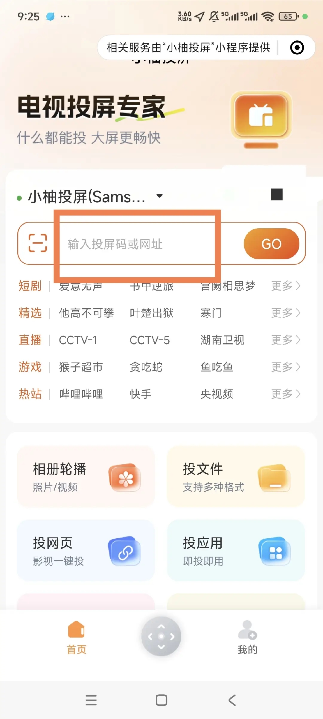 3、进入小程序之后,点击主页的搜索框,输入电视上出现的投屏码。