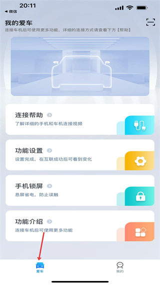 1、爱车,提供连接帮助、功能设置等入口,说明车机连接后解锁更多功能,是互联操作的核心起点。
