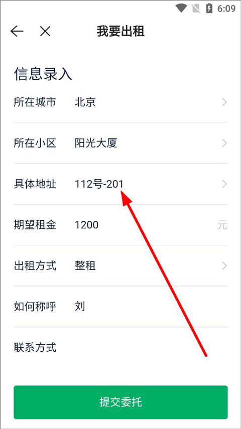 3、填写房源信息,信息包括所在城市、小区、具体地址、租金、出租方式等,填写好之后,点击下房的提交委托;