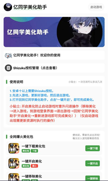 亿同学美化助手是一款专为吃鸡玩家打造的免费游戏美化工具软件,支持一键替换武器皮肤、修改地图色调、优化游戏界面等功能。通过系统授权或Shizuku权限方式快速导入美化包,全面提升游戏视觉体验,无需Root即可使用。软件界面清爽简洁,操作流程直观,是广大吃鸡玩家进行个性化定制的利器。