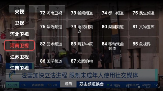 点击屏幕,然后再点击左上角换台,可以切换到频道节目选择页面。