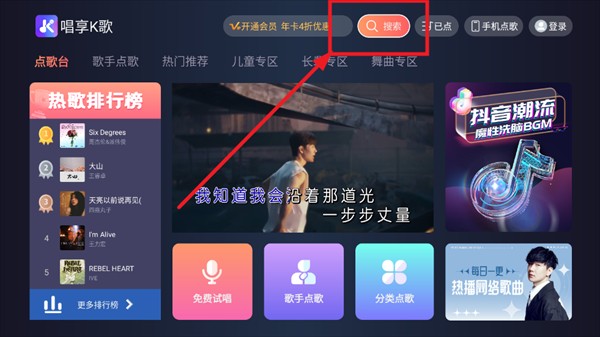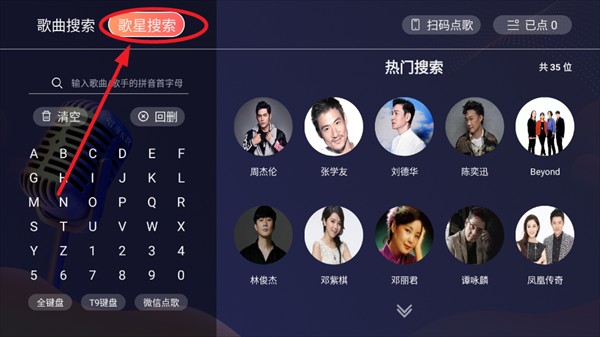 3、也可以选择点击上方搜索款,进入之后点击“歌星搜索”即可。