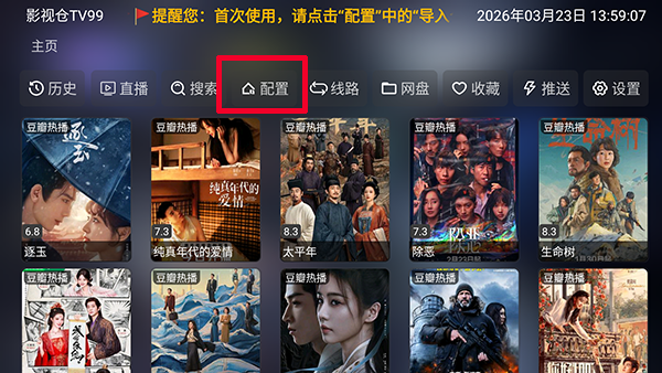 1、软件自带影视源接口配置,打开软件后需要先点击【配置】选项。