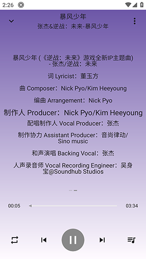 3、在音频文件中,点击播放后,在播放器界面可以查看歌词等内容。