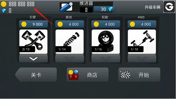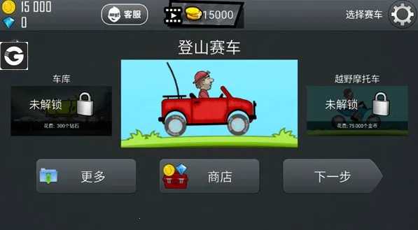 4、进入《登山赛车》后,我们需要通过关卡赚取一些金币,如下图所示,此时金币为15000。