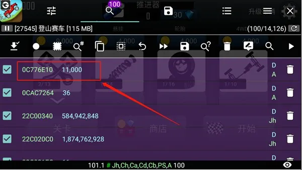 9、搜索完毕后,我们发现搜索出来的地址还是有很多,此时我们在游戏中消耗一些金币(消耗后的金币为11000)并重新操作6、7、8步骤(可重复操作)。