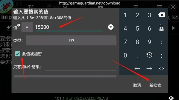 7、输入金币的数量并勾选【此值被加密】,点击【新搜索】。
