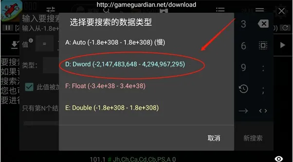 8、选择DWORD数据类型(此类型可加快搜索速度)。
