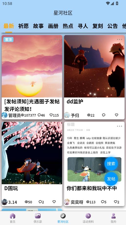 4、而光遇圈子则是各位玩家进行游戏心情分享的地方。有各种各样的心火,故事,画册,公告等。