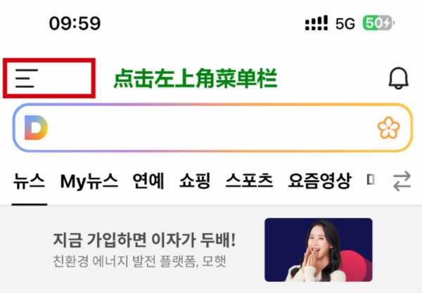 1、打开DaumCafe APP,首页点击左上角菜单栏。