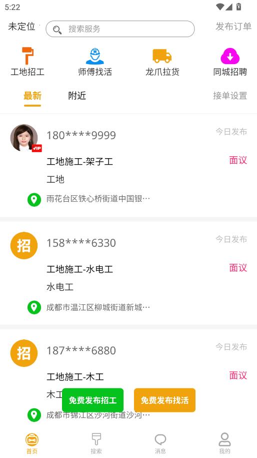 工人可浏览附近的招工信息,查看工地详情,并直接联系发单人。