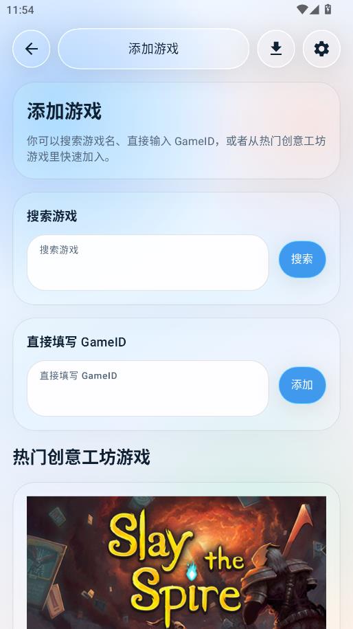 支持通过搜索游戏名、直接输入GameID或从热门创意工坊游戏列表中添加游戏,构建个人专属的模组游戏库。