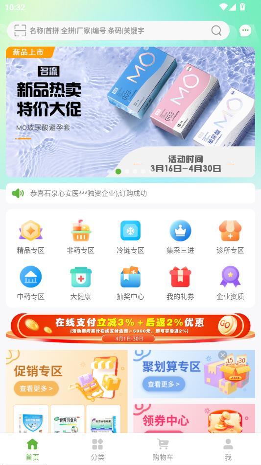 查找软件中最新发放的超值优惠券,并且在线领取大额优惠券享受采购药品的折扣;