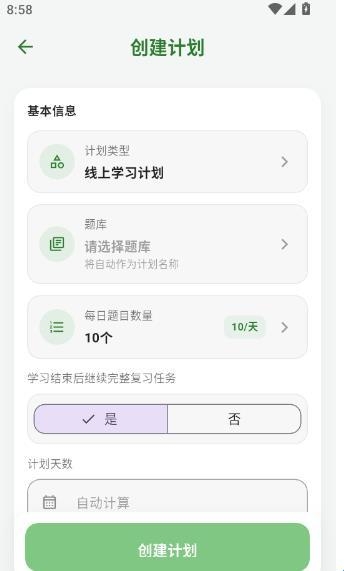 用户可以轻松设置每日学习任务,选择“线上学习计划”或“题库练习”等不同类型。支持自定义计划天数,系统会自动计算进度,帮助你有条不紊地完成阶段性目标。