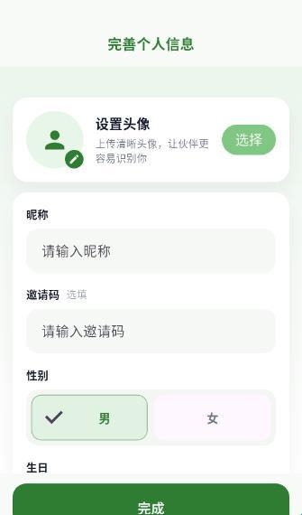 2、在“完善个人信息”界面中就可输入呢称和上传头像,点击“完成”按钮来进行下一步。