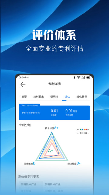 专利价值评估:通过算法模型,对专利的经济价值、技术价值和法律价值进行综合测算,生成详细的评估报告。
